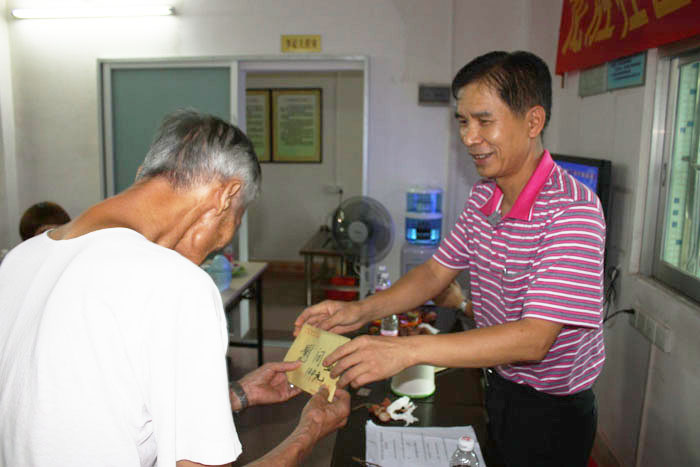 龙胜墟社区党支部书记张灼亮为老党员送上节日慰问金