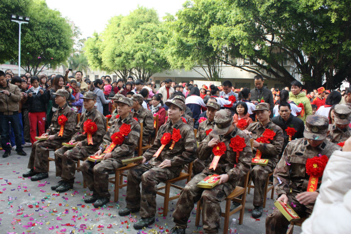 12月10日上午,龙胜镇政府大院喜气洋洋,2011年冬季欢送新兵仪式在这里拉开序幕。来自白村、大雄、棠红、联塘等村委会的14名光荣入伍的新兵,在这里即将带着家乡人民的重托,走上保家卫国的征途。龙胜镇机关全体干部、村(居)委会干部、新兵家属及亲朋好友等200多人参加本次欢送仪式。