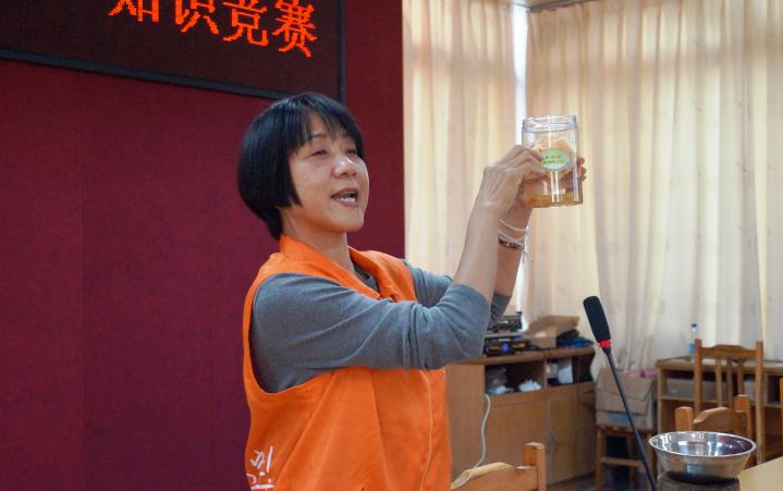 优秀义工”等称号的陈碧秀女士为大家授课。陈女士结合光盘教学,详细、生动地向大家讲解了环保酵素的意义及作用,并现场示范如何将厨余垃圾变废为宝,DIY环保酵素,鼓励大家动手制作,在生活中相互推广。另外,陈女士还将其已制作好的成品酵素和在场学员们一起分享。