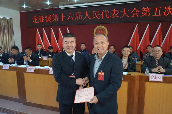 12月31日上午,龙胜镇召开第十六届人民代表大会第五次会议,选举产生了新一任人大主席和镇长。梁健忠同志全票当选为龙胜镇人民代表大会主席,利俊义同志全票当选为龙胜镇人民政府镇长。市人大常委会余荣深副主任以及市委组织部谭健勇副部长出席了会议。